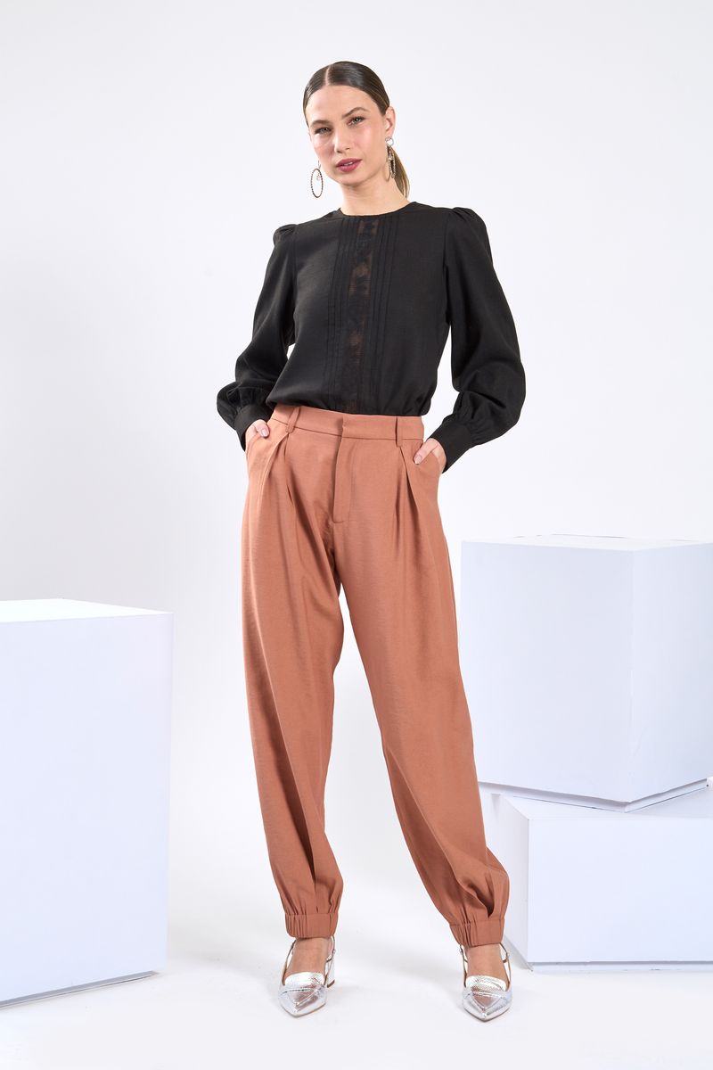A blusa det. renda é um modelo super delicado que carrega detalhes especiais. é confeccionada em em tecido de viscose/linho com superfície bem marcada com efeito rústico, porém delicado, com caimento leve e fluido. a peça ainda possui modelagem reta, gola arredondada e detalhe de renda frontal aplicado e pequenos franzidos nos ombros e no punho da manga, que tem comprimento longo. fechamento por botão posterior.
