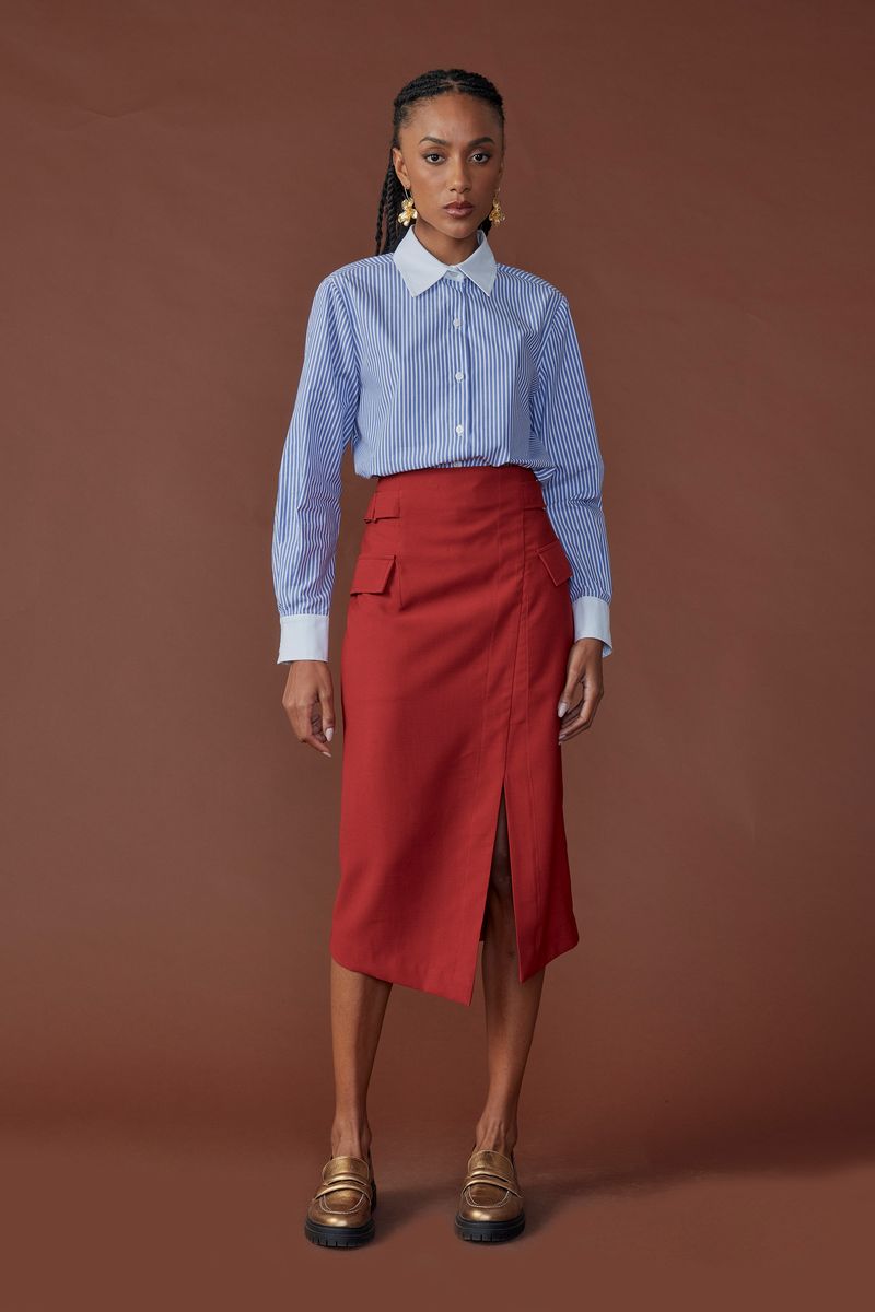 Camisa em tecido plano listrado com visual clássico e atemporal. Possui gola lapela, comprimento tradicional e mangas longas, perfeita para composições versáteis do dia a dia. O fechamento frontal por abotoamento completa o design com praticidade e sofisticação.