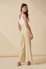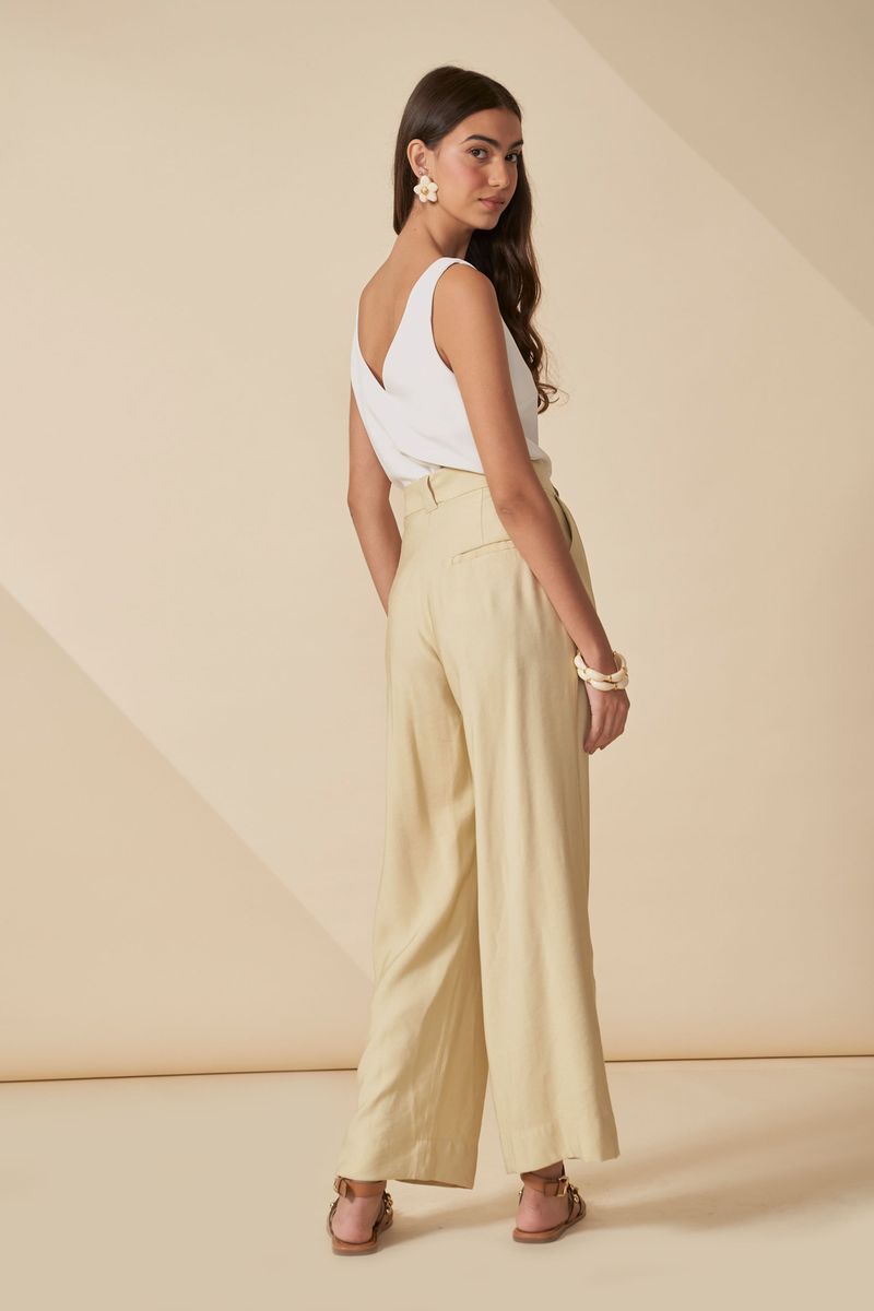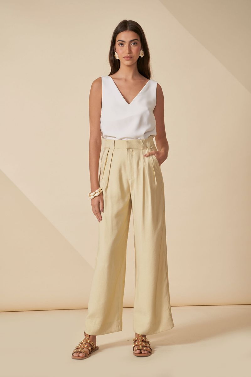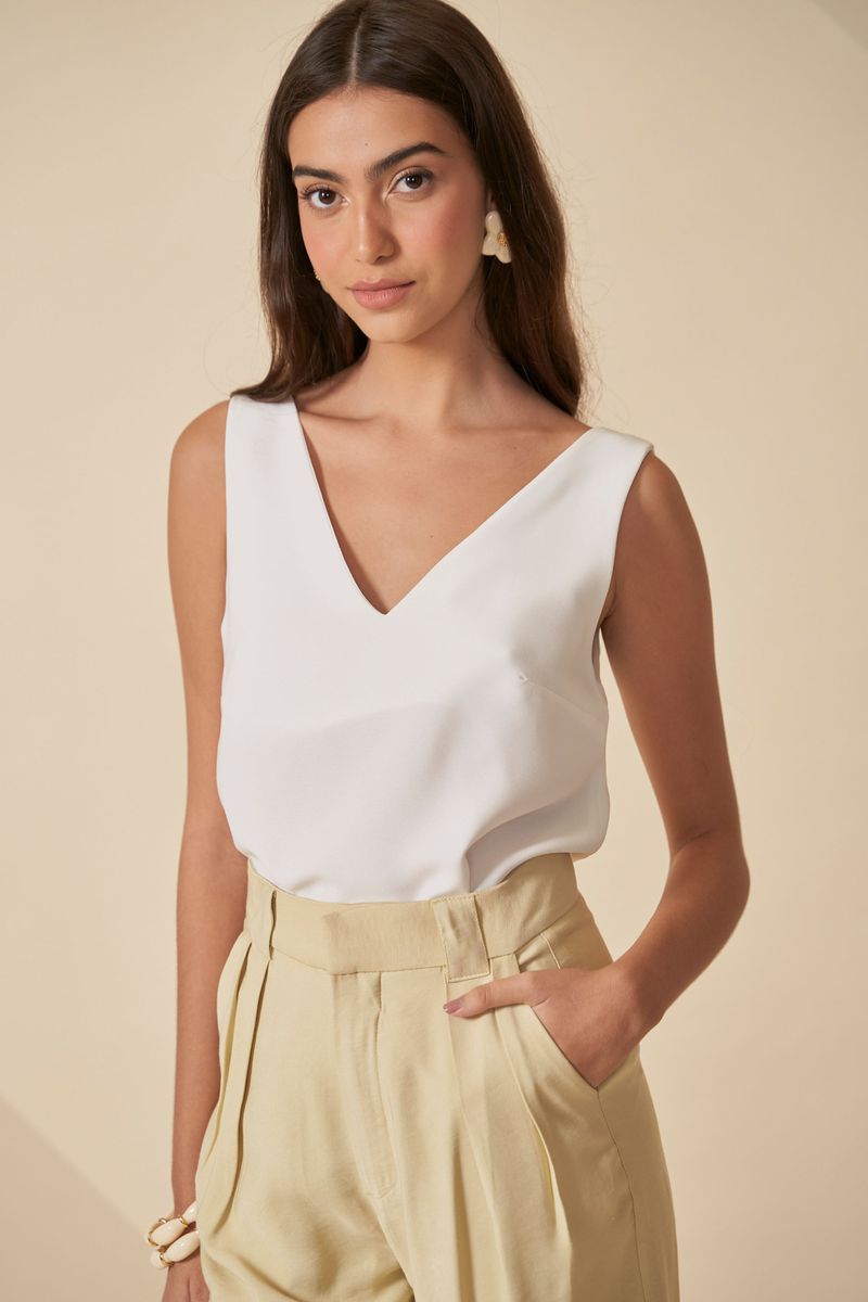 A blusa possui decote v cavas regulares, alças médias e comprimento até a cintura.