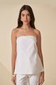 A blusa sem alça possui pregas laterais, comprimento alongado, fendas laterais e fechamento por zíper invisivel posterior.