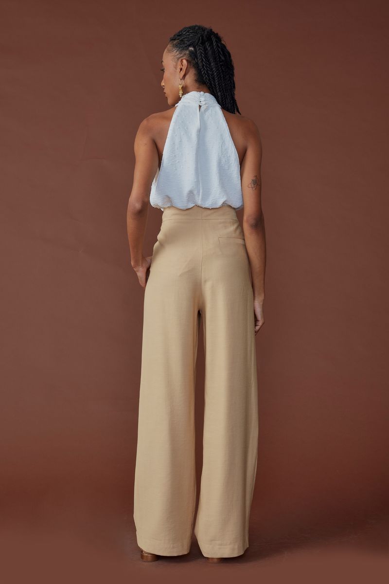 A blusa gola drapeada possui um shape solto ao corpo e é confeccionada em tecido leve com construção em jacquard, proporcionando um efeito de textura na superfície. A peça conta com decote redondo, sem manga e drapeados na gola. Fechamento por abotoamento.