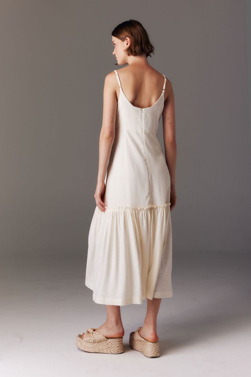saia com camada enviesada e detalhe de babadinhos aplicados na barra.