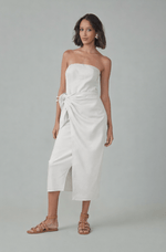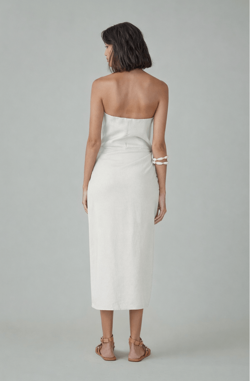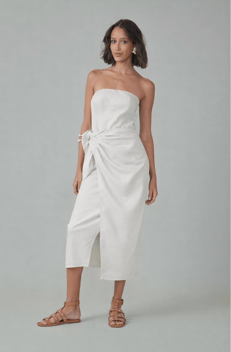O vestido sem alças, confeccionado em linho misto, comprimento midi, transpasse com amarração valorizando a silhueta.