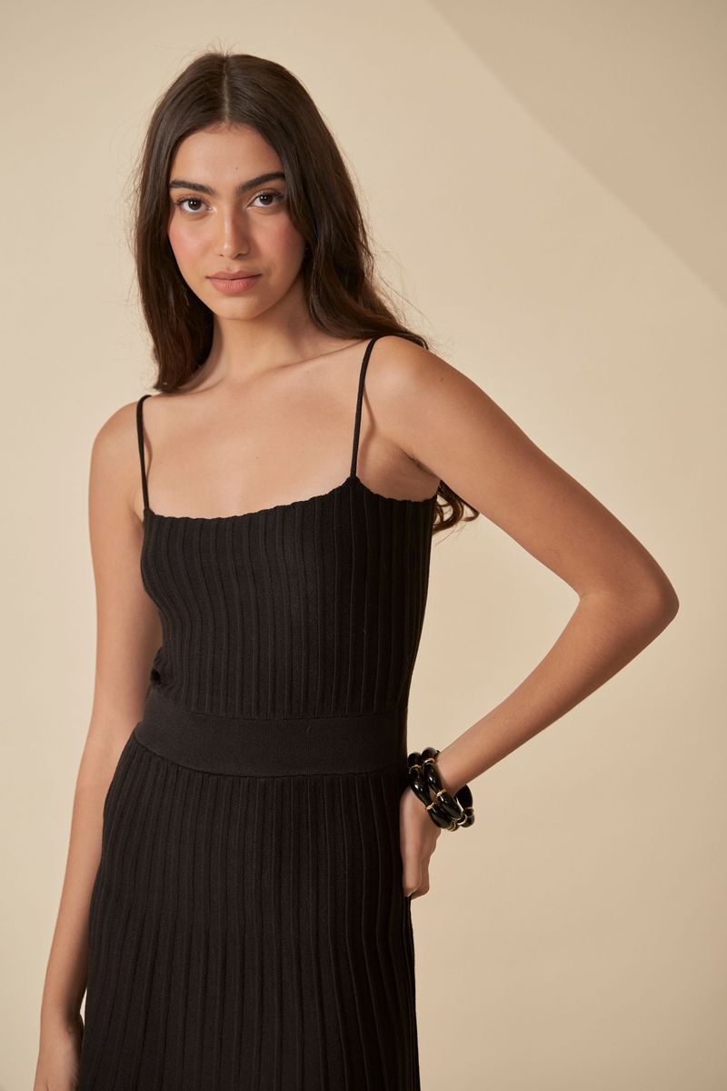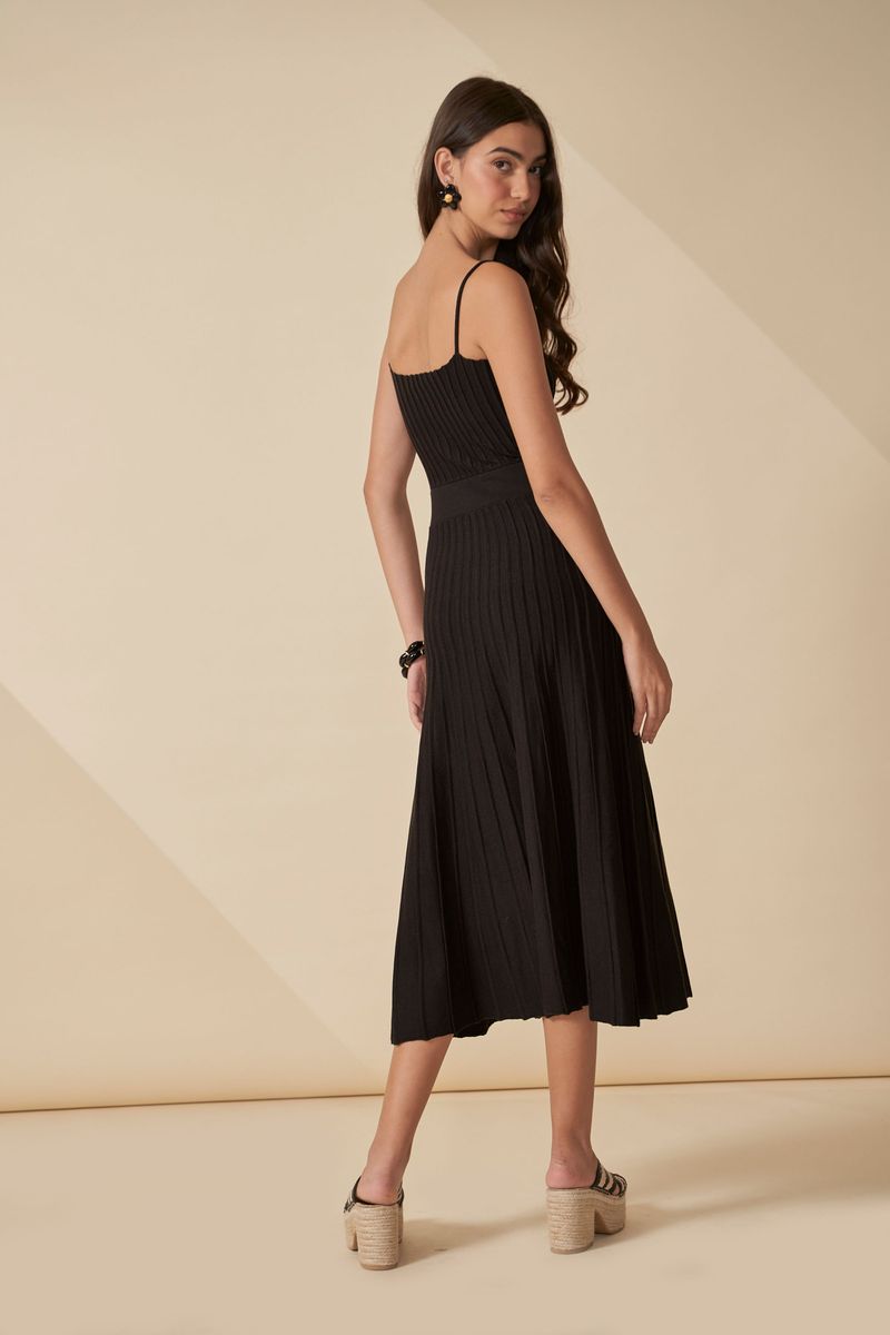 O vestido alça plissado é confeccionado em tecido com fibras acrílicas que aumenta sua durabilidade. com um estilo sofisticado de tricot, comprimento midi, alças finas, caimento fluído e detalhes plissados que dão charme à peça.