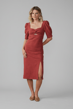 Vestido express decote torcido e fenda